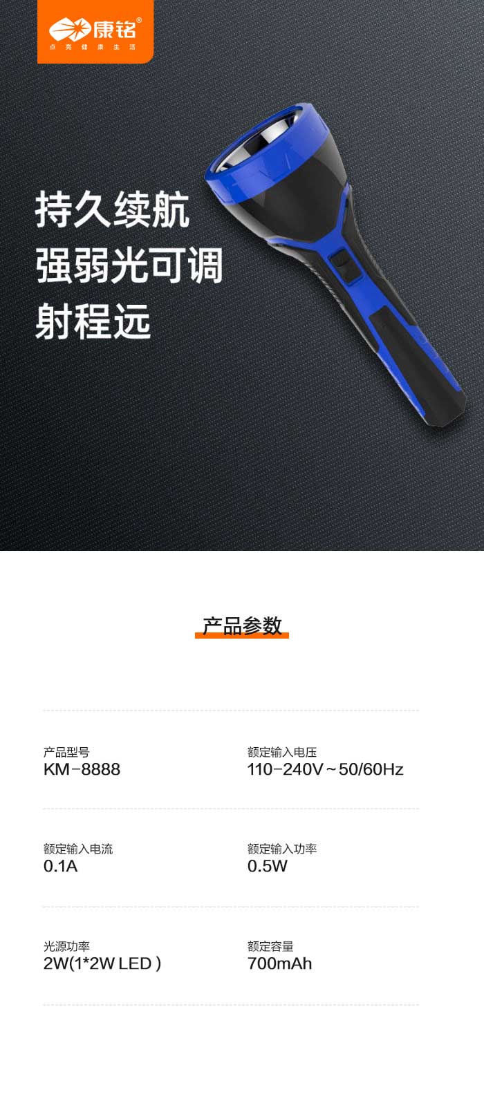 单位:个 KM-8888 LED手电,额定容量700mA,质保一年。