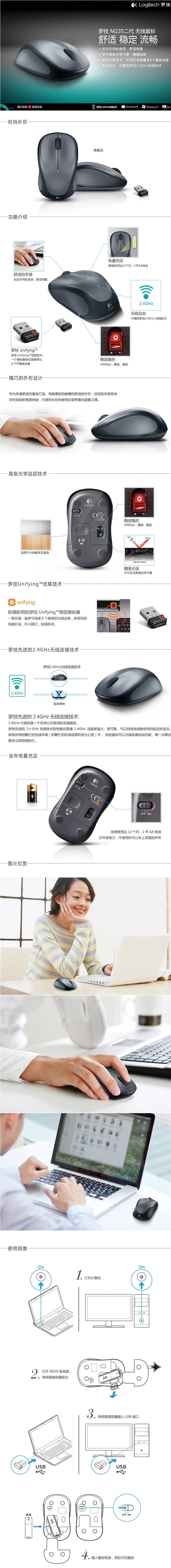单位:个 M235二代 适用于笔记本和台式机电脑,接收距离可达10米,背面带开关,需用1节5号电 池待机达12个月