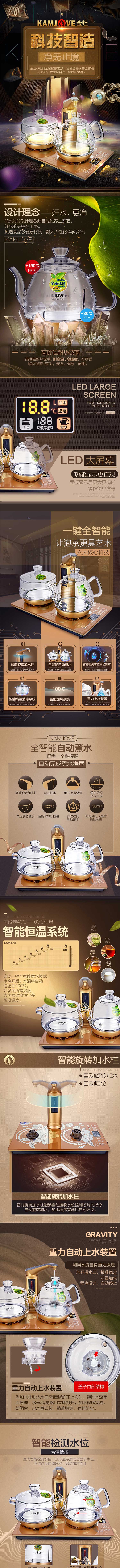 单位:台 G6 电水壶/上水壶1810W,上水/烧水/消毒,智能检测水位,重力自动上水装置,智能旋转加水柱,壶底食品级304不锈钢,水晶高硼硅材质,茶艺专用智能煮水系统,智能恒温,双击防误碰功能,30分钟无操作自动关机保护,质保一年。