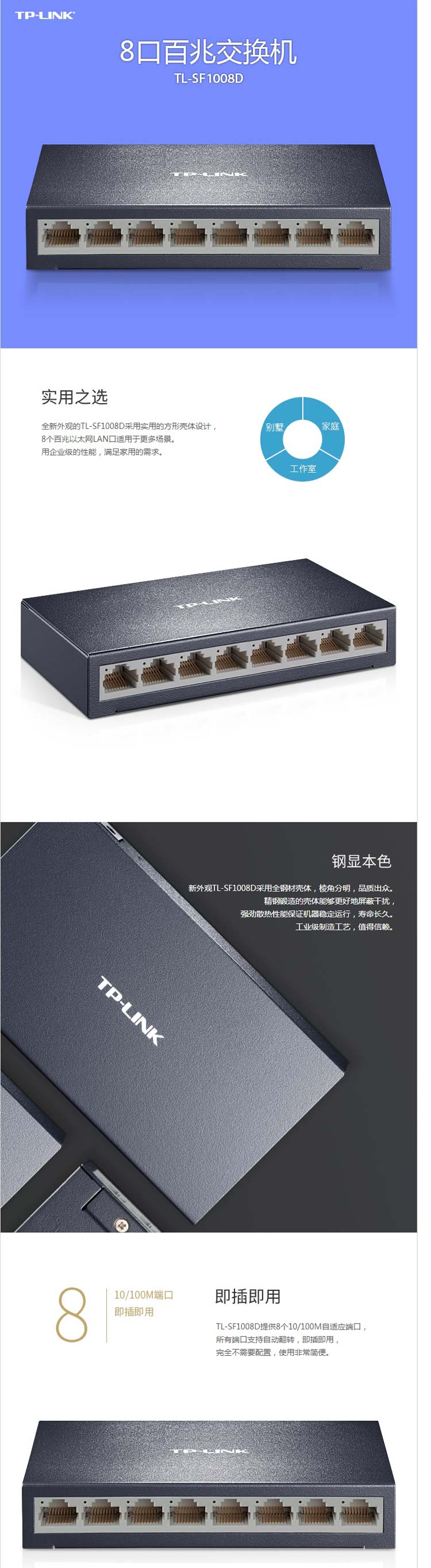单位:个 SF1008以太网交换器,全钢壳体,即插即用,8个10/100M自适应端口,所有端口支持自动翻转,质保一年。