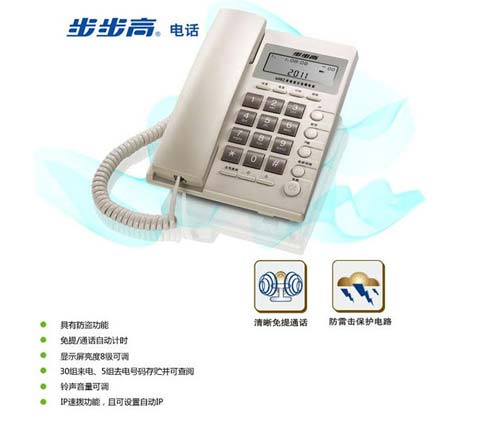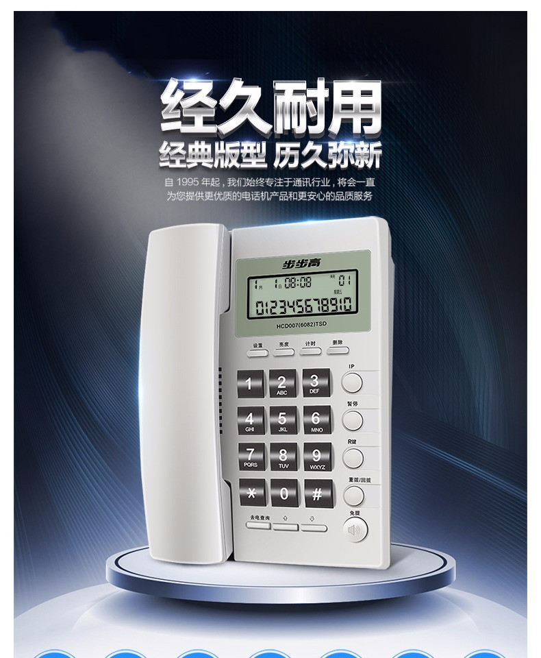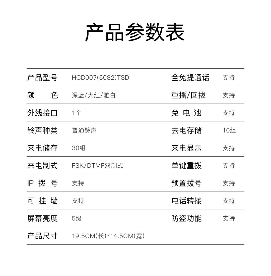 单位:台 HCD6082 防雷击,显示屏亮度8级可调,通话自动计时,具有防盗功能,清晰免提通话,质保一年。