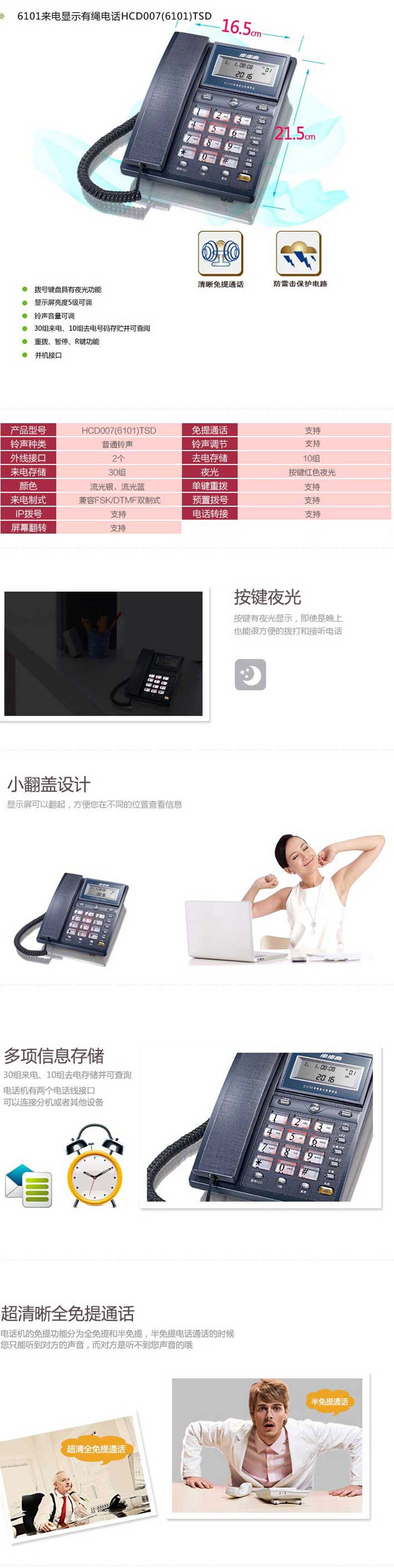 单位:部 HCD6101 防雷击,显示屏亮度5级可调,按键红色夜光,并机接口,清晰免提通话,质保一年。
