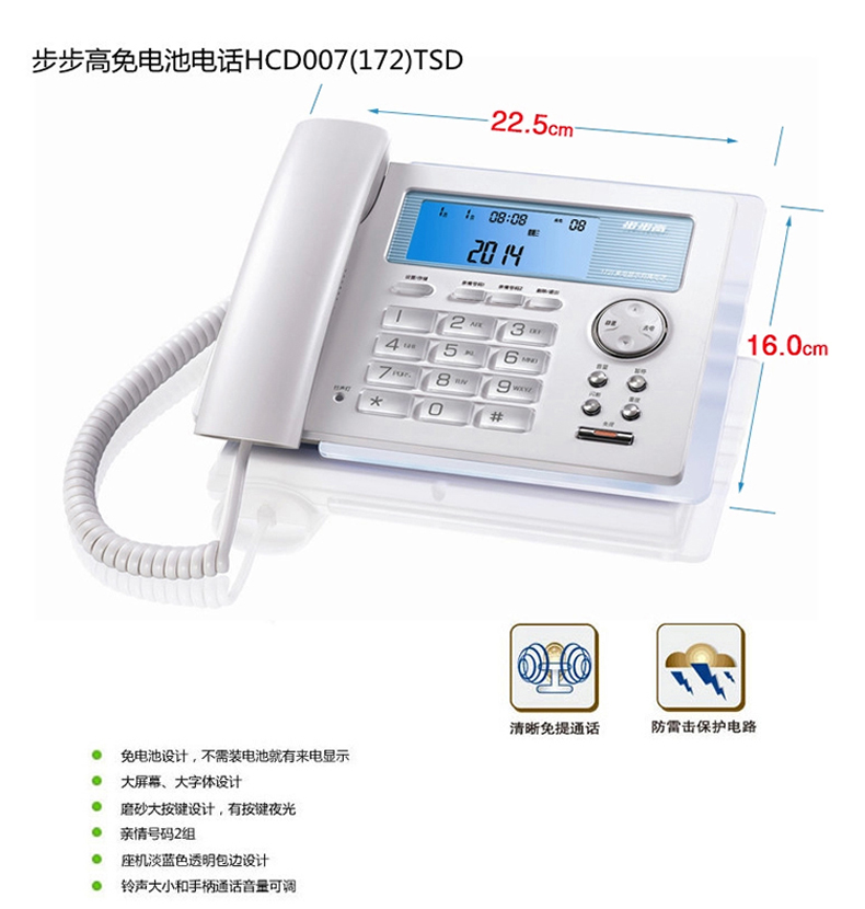 单位:部 HCD172 防雷击,2组亲情号码一键拨出,磨砂大按键,屏幕夜光,清晰免提通话,质保一年。