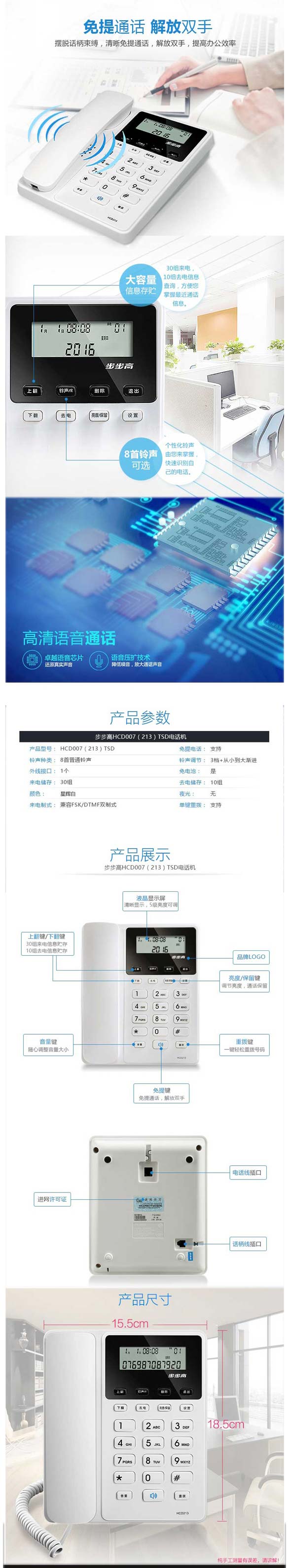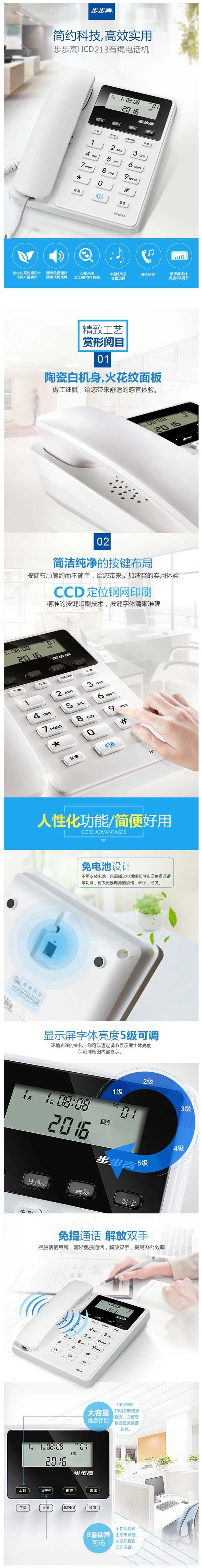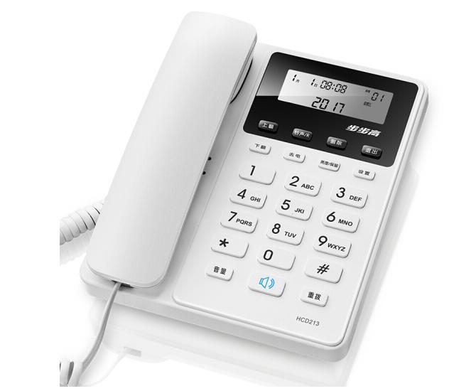 单位:部 HCD213陶瓷白机身火花纹面板,CCD定位钢网印刷按键,显示屏亮度5级可调,通话保留,清晰免提通话,质保一年。