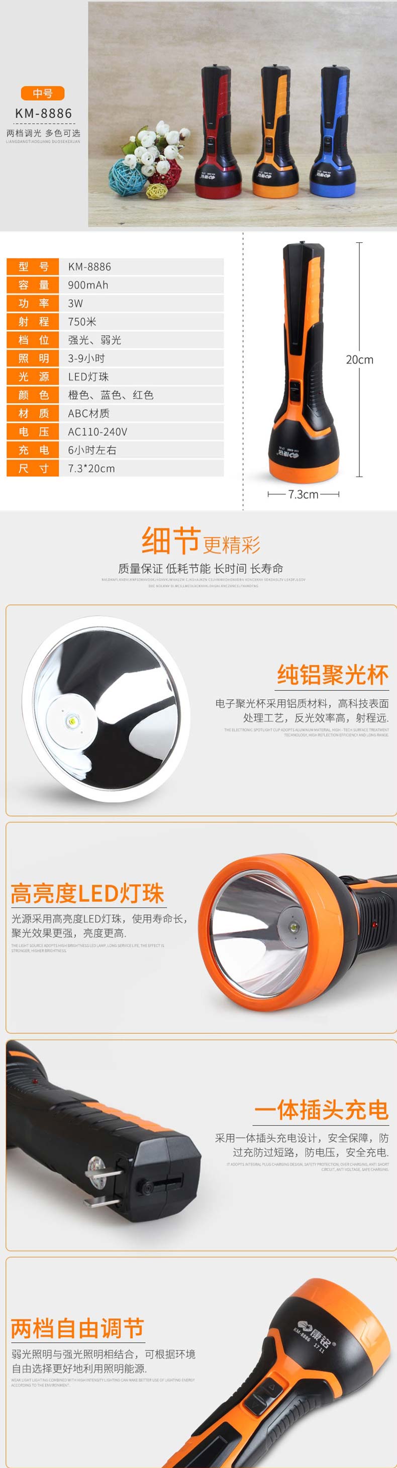 单位:个 KM-8886 LED手电20cm,额定容量900mA,防过充保护,射程750米,充电6小时左右,质保一年。