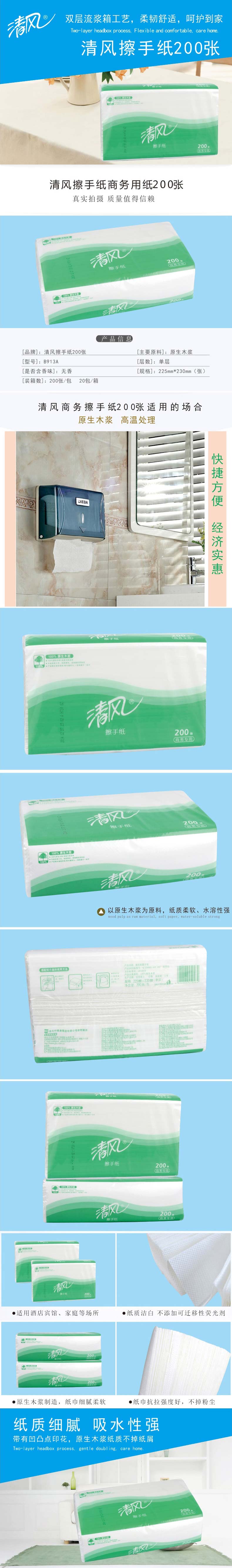 单位:包 B913A纸巾225*230mm,适配方形擦手纸架,包装率1/20