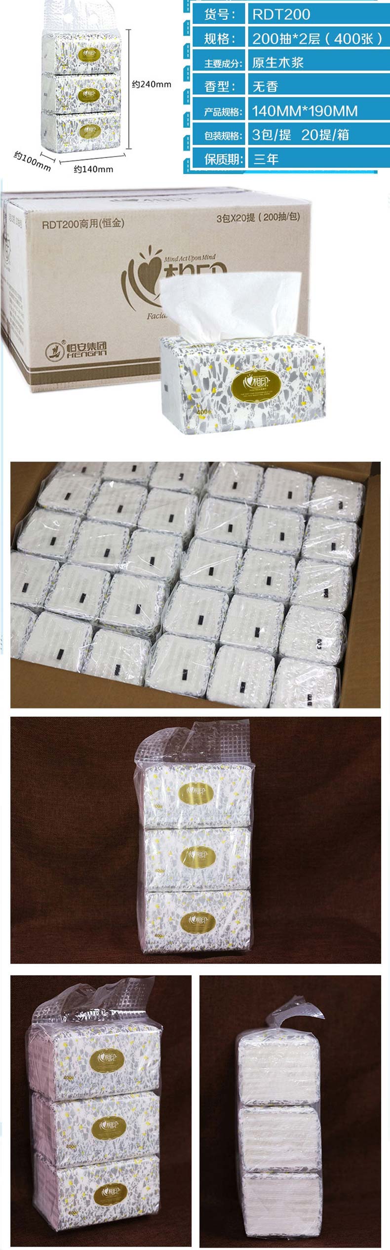 单位:提 RDT200 纸抽/抽纸/纸巾14*19cm,商用系列二层,3包/提,包装率1/20
