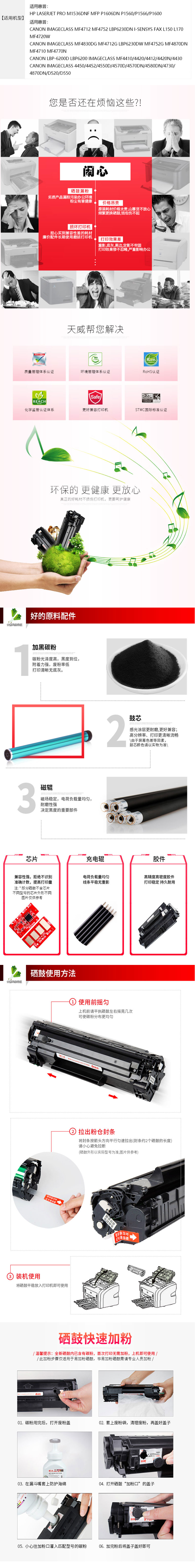 单位:个 适用惠普 P1560,P1566,P1606,P1606dn,M1536dnf,适用佳能 MF4752,M4410,M4450,4570DN,D520,D550等打印机型粉盒。