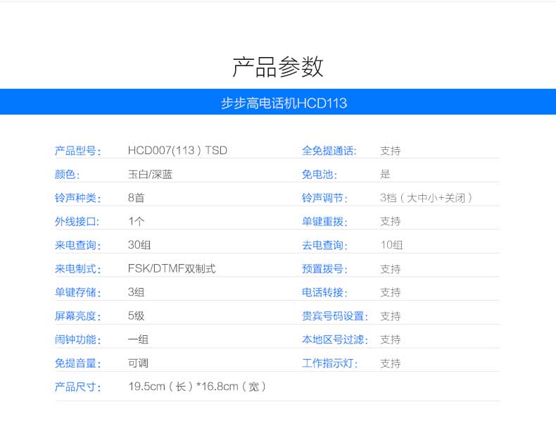 单位:部 HCD113欧式风格,镀络工艺,磨砂手感,显示屏亮度5级可调,通话保留,清晰免提通话,质保一年。