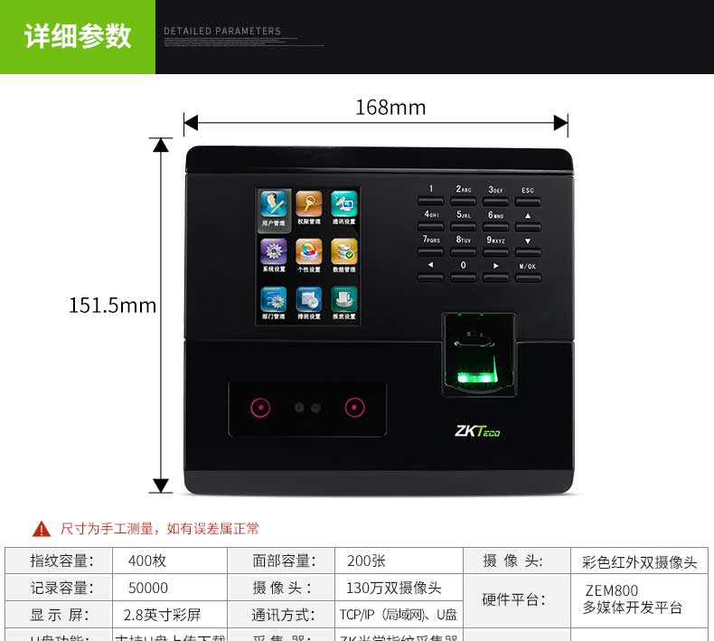 单位:台 S202plus打卡机,2.8寸高清彩屏,面部容量200张,指纹容量400枚,记录容量5万条,适合120人以下使用,简单门禁功能,质保一年,电源适配器保修三个月。