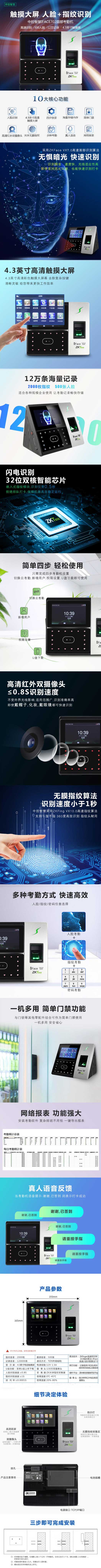 单位:台 #702打卡机,4.3寸高清彩屏,面部容量500张,指纹容量2000枚,记录容量12万条,简单门禁,网络报表,多种考勤,无惧暗光快速识别,质保一年,电源适配器保修三个月。