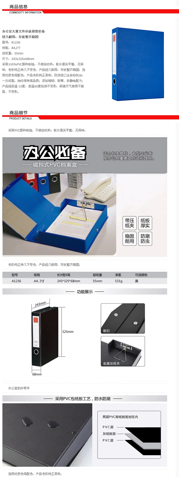 单位:个 A1236 附压纸夹2寸A4蓝色 包装率1/14