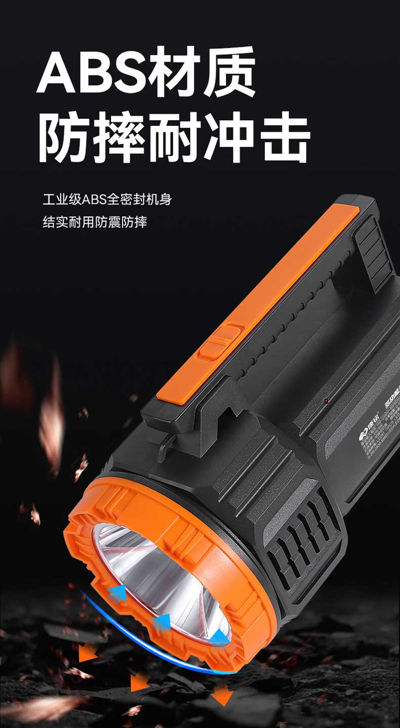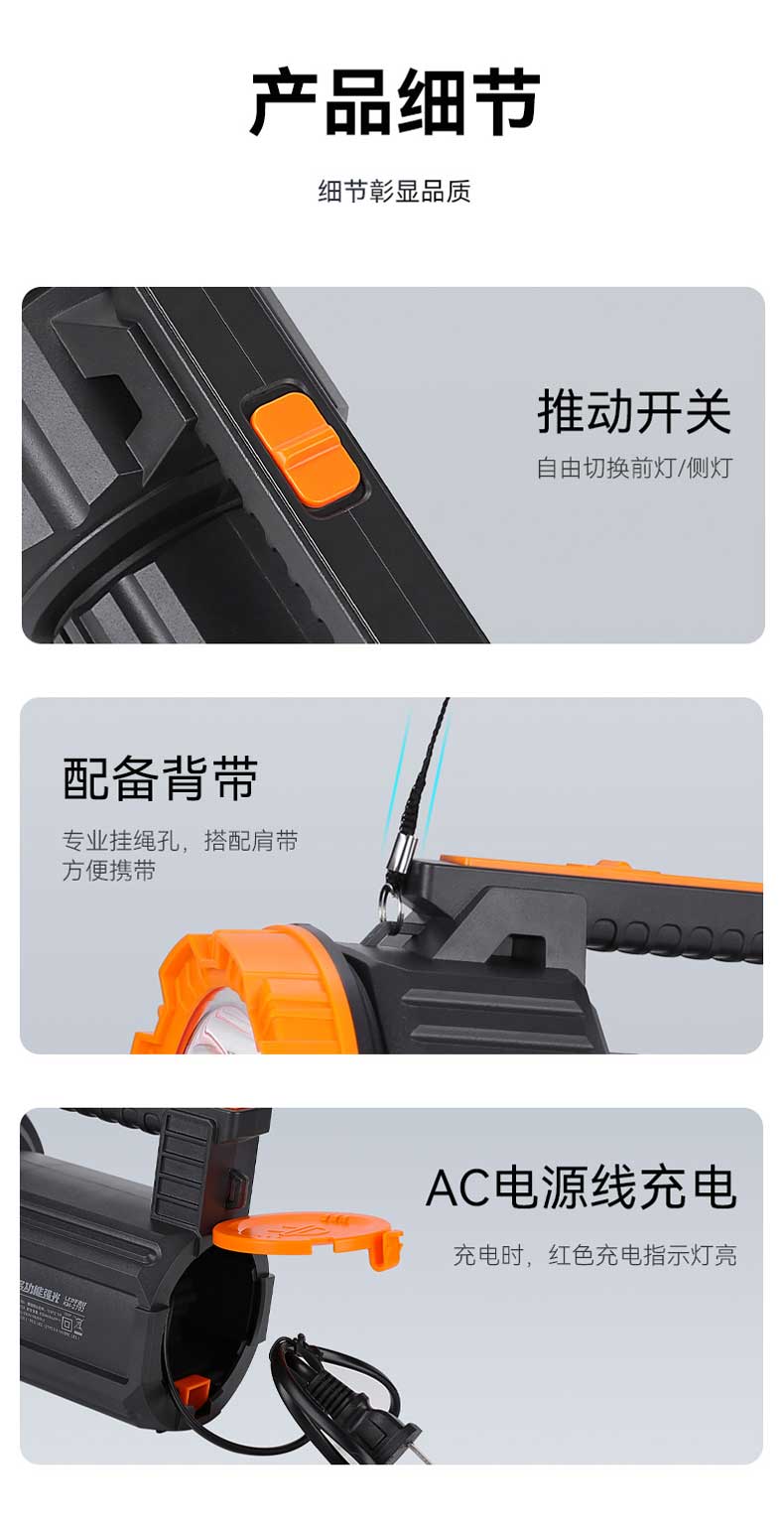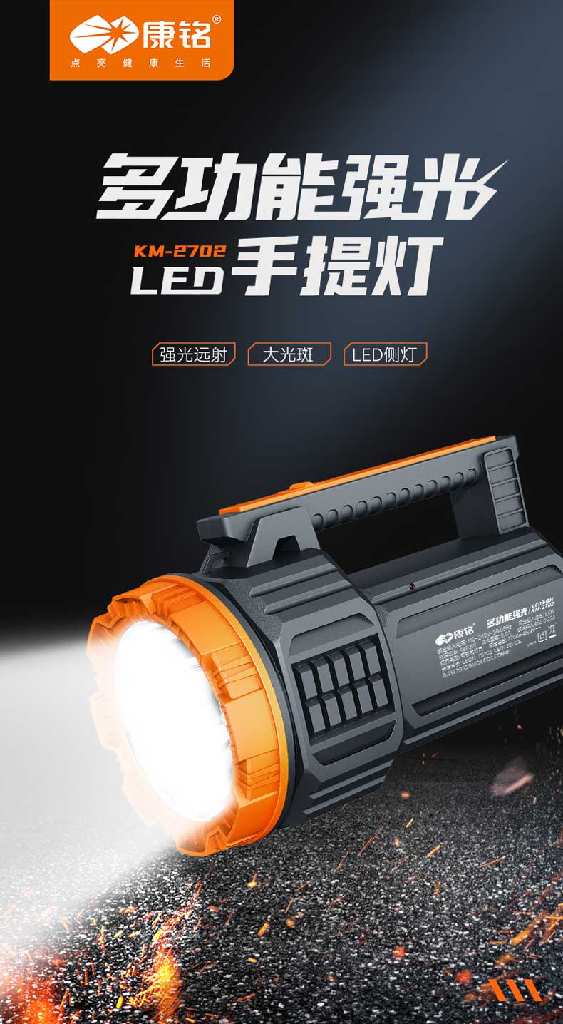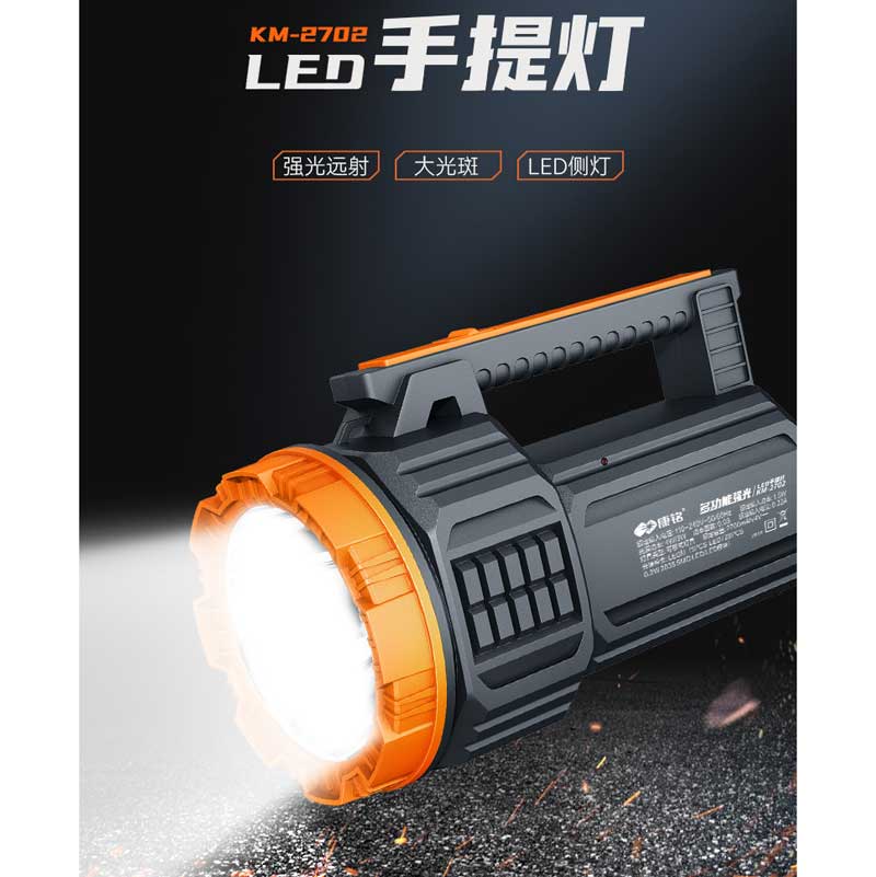 单位:个 KM-2702 强光手电筒/探照灯/户外应急灯,额定容量2700mA,多功能LED侧灯,AC电源线充电,防摔防滑耐冲击,质保一年。