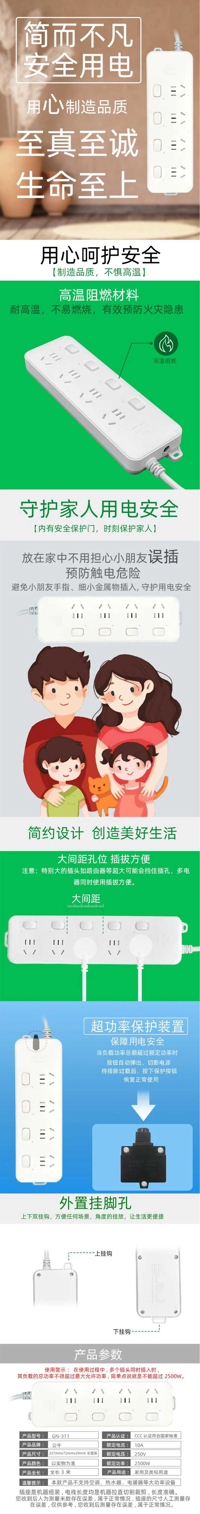 单位:个 GN311 四联单门单控过载保护插座/排插/插线板