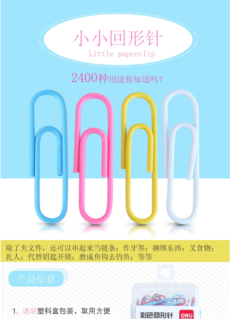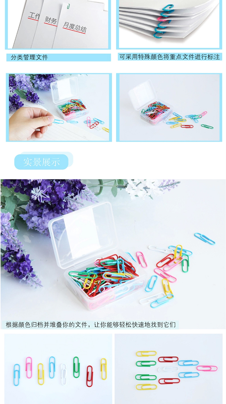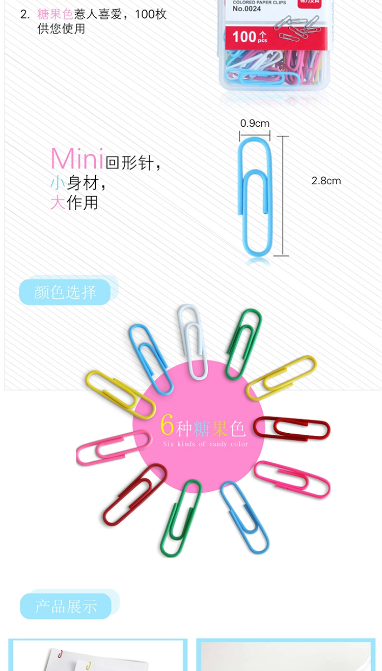 特点:彩色回形针,适用于文件分类管理,标注重点文件等。增加办公乐趣
