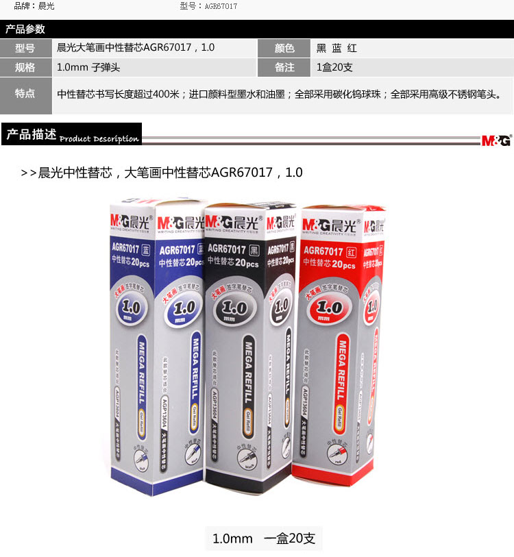 单位:支 AGR67017A子弹头大笔画笔芯/中性替芯 包装率1/20/240