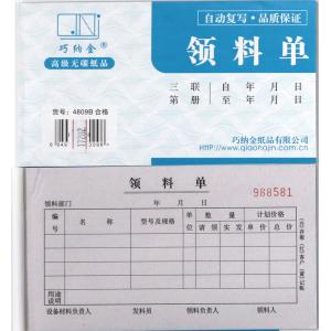 特点:自带垫本,自动复写。(编号、名称、型号及规格、单位、数量{请领、实发},计划价格{单价、总价})