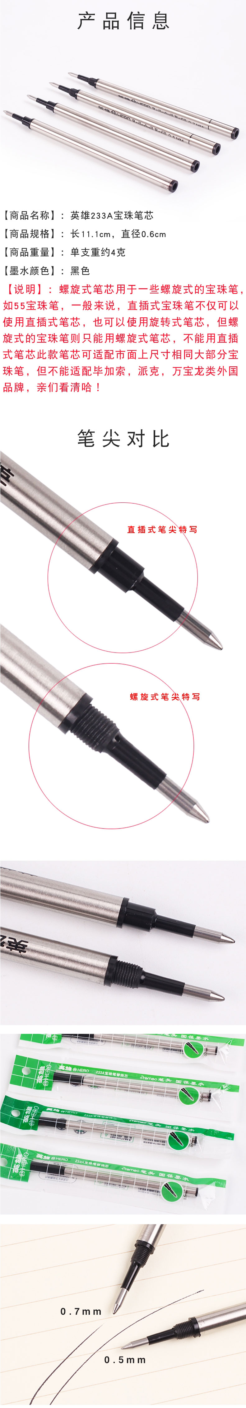 特点:本品为上海英雄丽水厂出品的,中国第一代赶超世界级制笔工艺水准产品, 屡获殊荣, 款式经典.手感纤巧. 笔尖顺滑流畅,为您带来完美的书写感受。宝珠笔芯为插口式笔尖,笔身长度为11CM,书写为0.5MM。通用于各种品牌的宝珠笔身
